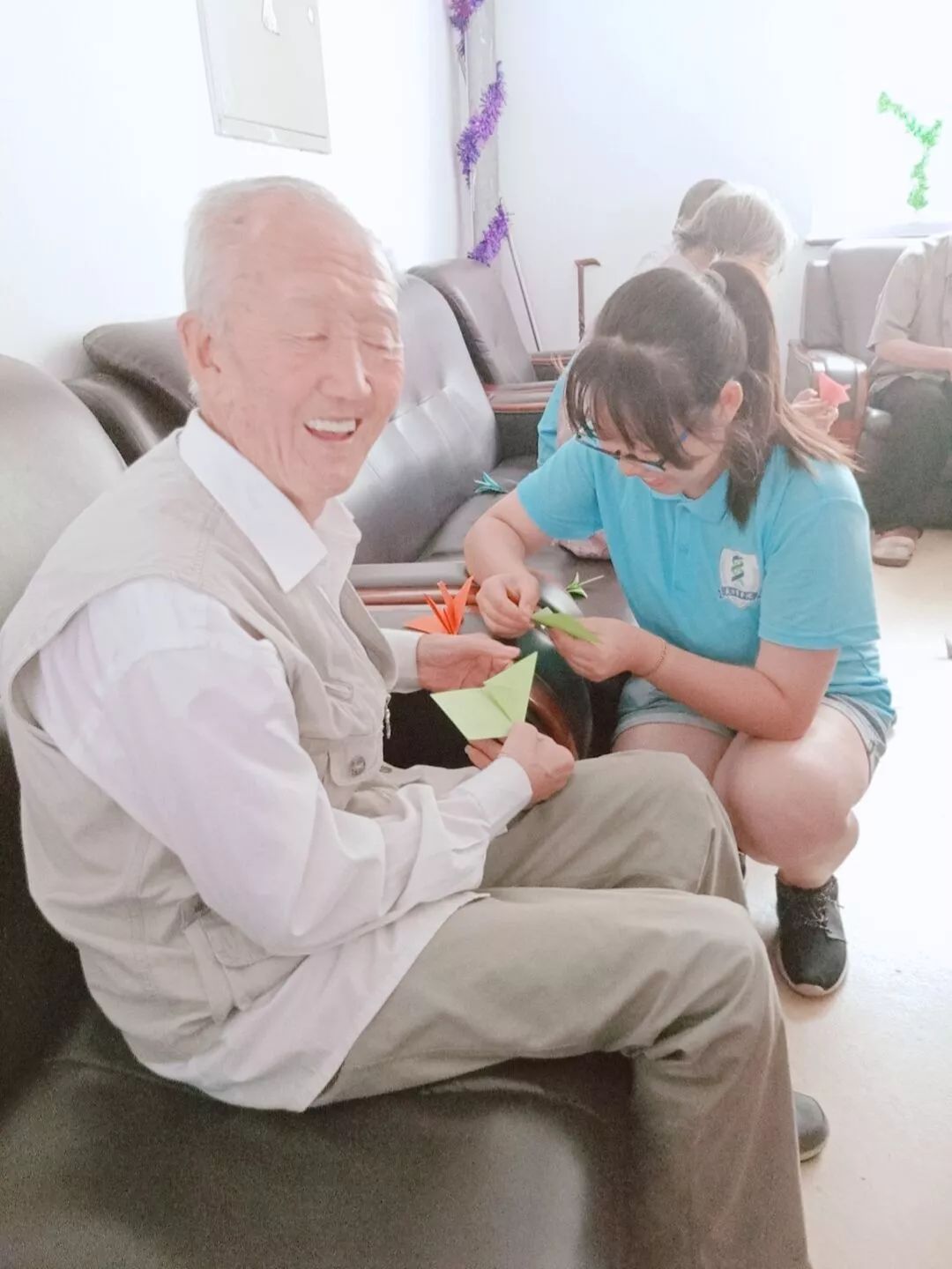 新颖的“飞鹤令”,以千纸鹤为载体,书十九大精神和社会主义思想等内容,志愿者和老人们在感受折纸乐趣的过程中,也针对社会时事进行深入了解,将整个活动推向高潮。