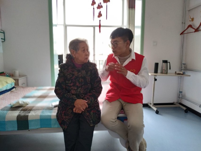 活动现场,志愿者们在医院负责人的配合下分工合作。有的陪老人聊天,了解老人的入住医养结合医院的心理状况,帮助发现问题并及时进行开导;有的则陪伴老人进行娱乐活动,如下象棋,看电视;还有些志愿者运用所学知识为失能老人进行被动康复运动,协助工作人员给老人打饭、喂饭,参与生活护理工作;科研小组成员通过调查问卷的形式了解老人们的心理健康状况,关注老年人的晚年生活。志愿者们还就国庆阅兵和主题教育活动与老人们进行交流,老人们表示在习近平总书记的带领下,我们国家一定会越来越繁荣富强,也希望志愿者们珍惜现在的美好生活,以青春建功的实际行动为祖国发展贡献青春力量。