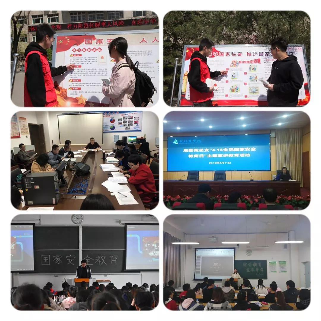 2019年4月15日是《国家安全法》颁布实施第四个“全民国家安全教育日”。为了更好地贯彻习近平总书记全面依法治国新理念新思想新战略,提高公民国家安全意识,公司组织开展了以“坚持总体国家安全观,着力防范化解重大风险,喜迎中华人民共和国成立70周年”为主题的系列宣传活动。学校精心制作了《国家安全法》《反恐怖主义法》《反间谍法》等多块宣传展板,并在大屏幕播出保密宣传教育片,吸引大批员工驻足观看。各院系通过主题班会、知识竞答、主题讲座、观看安全教育影片等多种形式进行国家安全教育。