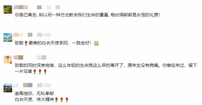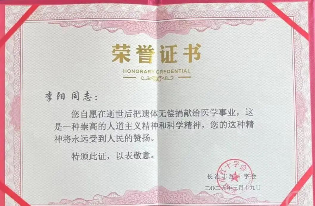 2025年3月19日,在签署《中国人体器官捐献自愿书》5天后,李阳不幸离世,在市红十字会和相关部门的协调下,其遗体顺利捐献,用于科研工作。她的善举很快感动了众多网友,这温暖而又坚定的力量,如同春光穿透云层倾泻而下,带给人间一场新绿,接续爱的无垠篇章与人性的光辉伟大。
