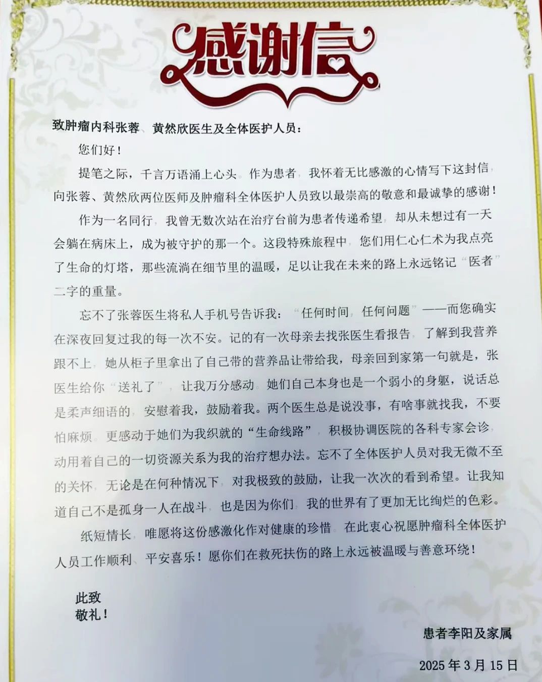 如今,李阳的遗愿得以完成。正如李阳的母亲所说,她并未走远,而是以另一种方式“活着”。 她用生命的最后一丝热献身医学 “忘不了全体医护人员对我无微不至的关怀和极大的鼓励,让我一次次看到希望,让我知道自己不是一个人在战斗,让我的世界充满无比绚丽的色彩……”一封致和平医院肿瘤内科全体医护人员的《感谢信》,让人读之动容。