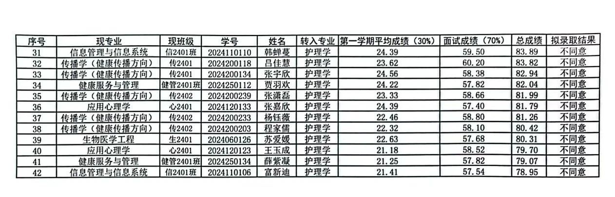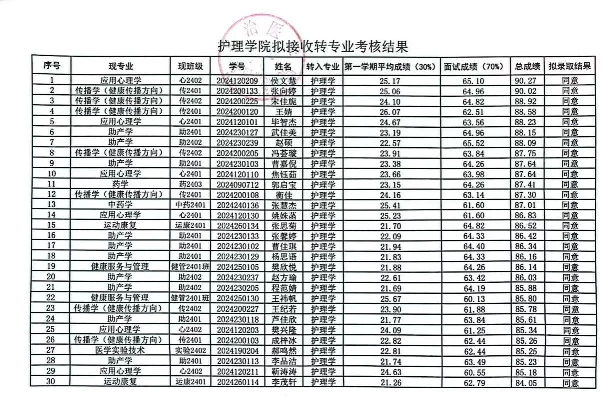 根据《6776永利集团本科员工转专业管理规定》(长医教字(2021)39号)有关规定,由员工本人提出申请,经员工所在院系部资格审查、6776永利集团考核通过,同意侯文慧等三十名员工转入护理学专业。现对拟转入员工成绩进行公示。