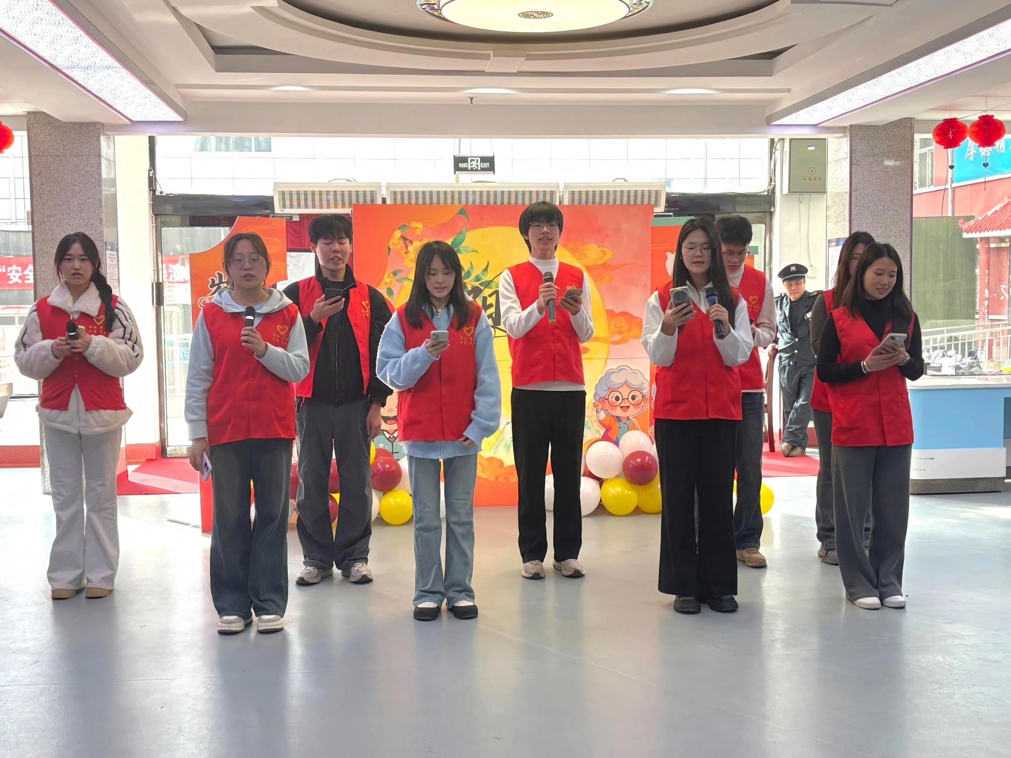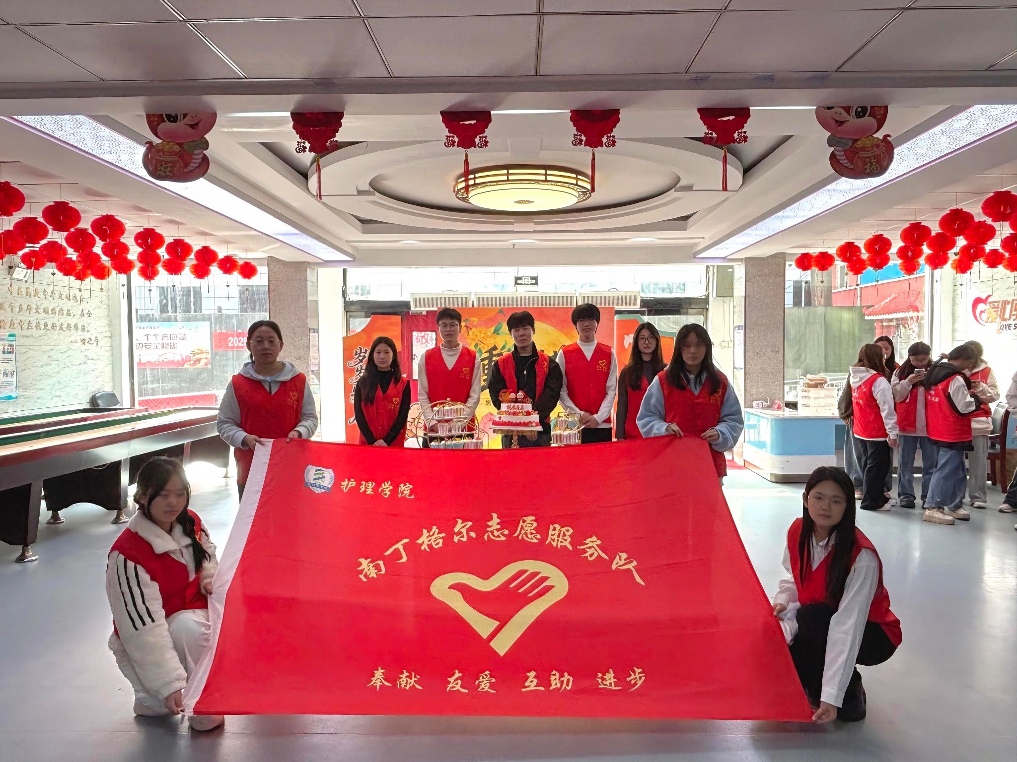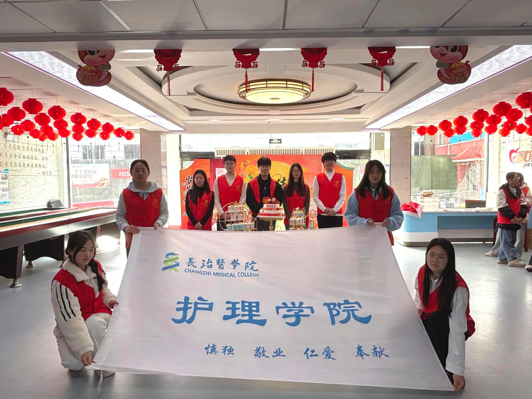 志愿者们向老人们送去真挚的祝福与热情的表演,养老院的领导与护工们也献上他们的祝福,为老人们表演节目,送红围巾,分发蛋糕,现场气氛热烈。