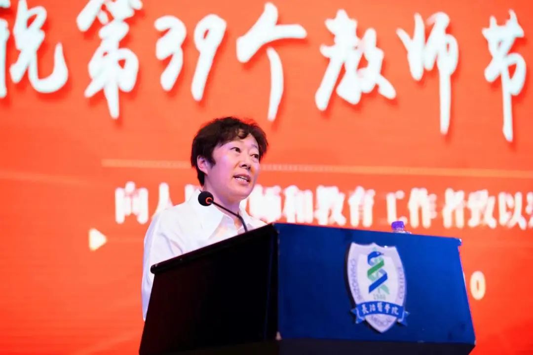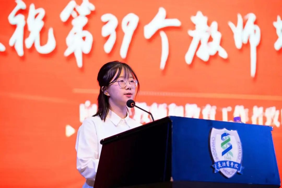 优秀教师代表李银涛、优秀教育工作者代表谢冰发言,他们分别分享了自己的公司产品经验,深刻表达了对教育事业的热爱,并表示将继续牢固树立“躬耕教坛,强国有我”的志向和抱负,书写教育新篇章。第一临床学院员工代表陈玉璐满怀深情地向全体教师献词,表达了员工对老师无限的尊敬、爱戴、感激之情。