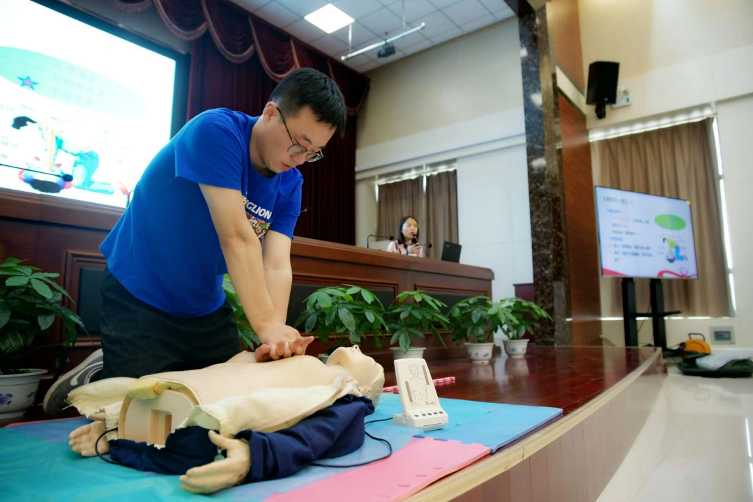 活动中,精神卫生系庞晓华老师从心理健康角度,讲解了如何及时缓解压力、消除恐慌情绪、保持良好的心态等方面的心理调节方法和技巧;护理学系张静老师围绕如何进行心肺复苏以及自动体外除颤器的使用方法进行了详细讲解,员工志愿者进行了心肺复苏现场演示。