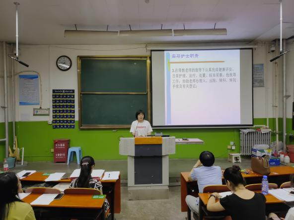 护理学系党总支书记石虹对实习有关的问题进行补充,同时对同学们提出殷切的期望:希望同学们在实习中要做好角色转变,严格要求自己,摆正心态,牢记“厚德 精业 济世 报国”的校训,全方位提升自己,成长为一名优秀的护理人才!