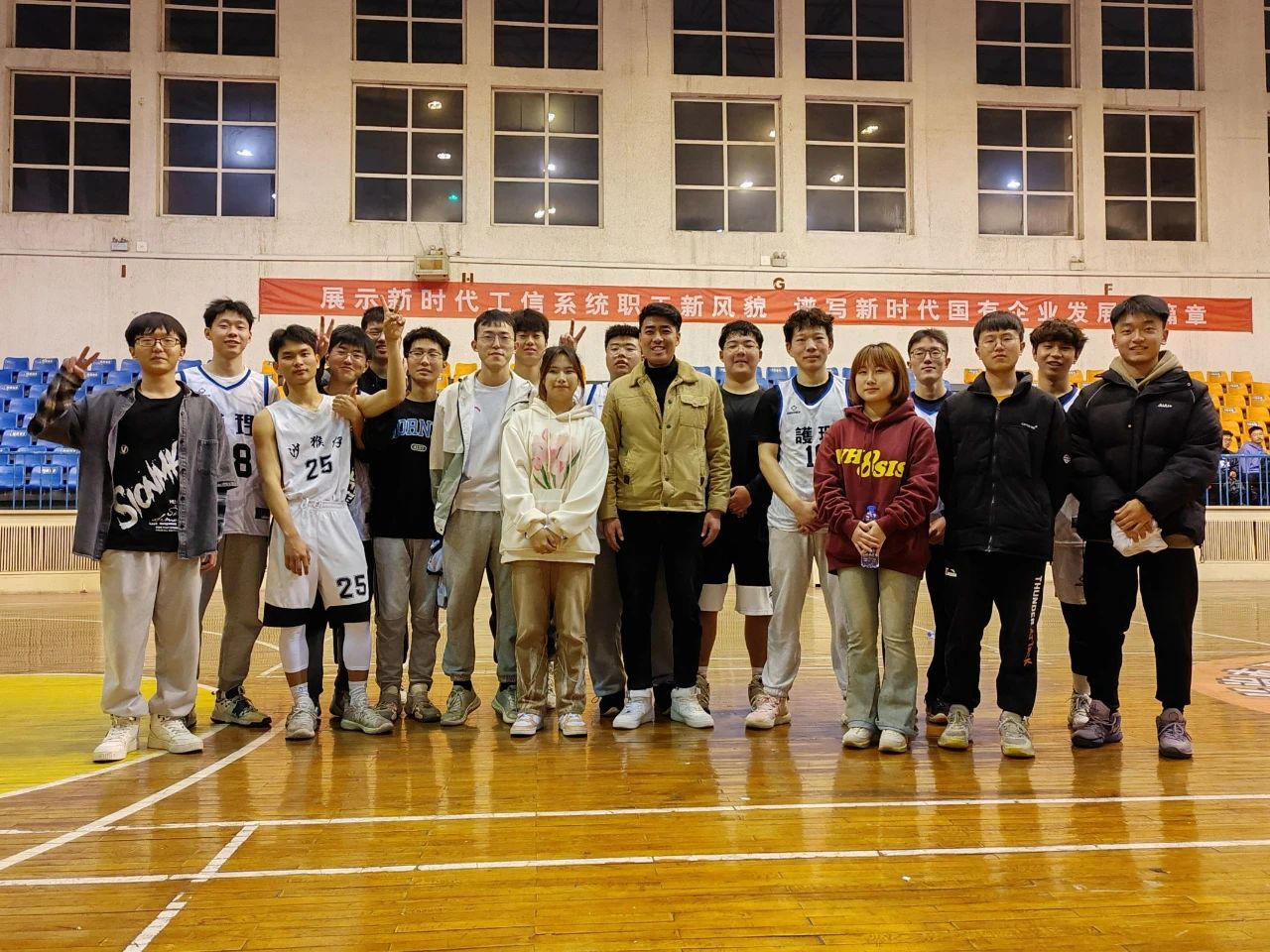 护理学系分团委书记谢冰老师也来到了比赛现场,肯定了队员们的表现,对如何更好开展高质量员工活动提出了建议,随后谢冰老师和同学们一起高唱歌曲《超越梦想》,表达了对同学们的美好祝愿。最终,比分定格在43:42(影像:护理),本次“护影杯”篮球赛圆满结束。