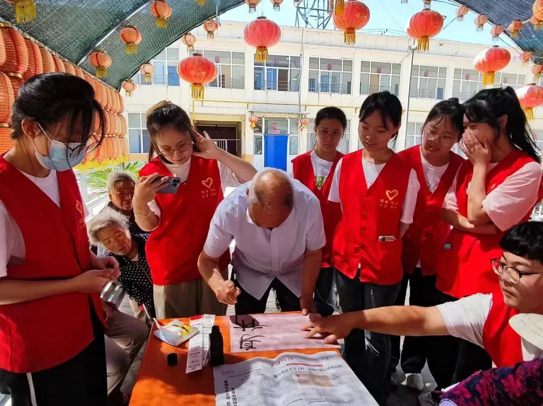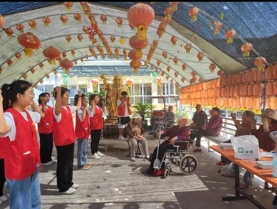 到达养老院之后,志愿服务队队员首先向老人们作了简单的自我介绍,并向爷爷奶奶们问好,接着开始为老人们测血糖、测量血压,老人们不时提问,同学们耐心解答,并叮嘱血糖、血压过高的老人,在日常生活中饮食尽量少油少盐,多吃蔬菜,合理用药,坚持锻炼身体。之后,志愿者陪着老人们拉家常、给他们讲笑话,并帮助打扫卫生、挂门帘等,做一些力所能及的事情,为老人们送去关爱和温暖,老人们拉着志愿者的手嘘寒问暖,也让服务队的成员们倍感温暖,真切感受到老一辈对年轻一代的殷切期望和关怀;在活动过程中,老人们给志愿者们讲述了他们年轻时的故事,大家一起合唱了《没有共产党就没有新中国》等红色经典歌曲,志愿者和老人们一起学做了《红星闪闪》手指操,并一起做了互动游戏,随着音乐律动,笑容洋溢在每个人的脸上;接下来,一位爷爷拿出准备好的笔墨纸砚,为志愿者们在纸上写下“身体好才是幸福”、“前程似锦”的美好祝福,寄托了老一辈对于我们青年一代的希冀;最后,张静老师带队员们来到一位奶奶的小院——艺术之家,奶奶给我们讲述了这个小院的设计风格,队员们在花草中感悟到艺术的魅力,体会着岁月静好。