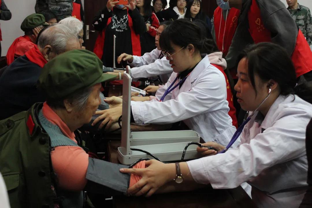 参观结束后,师生利用自己的专业所长,为老人们进行了测量血压、测血糖等常规检查。认真细致地解答老人们关于健康问题的咨询,志愿者们与老人们促膝交谈,关切询问老人们的生活情况和身体近况,表达了师生们的关爱与感恩之情。