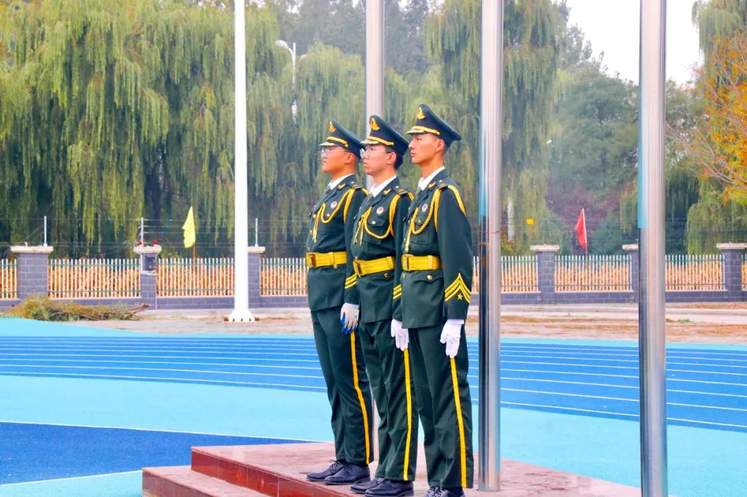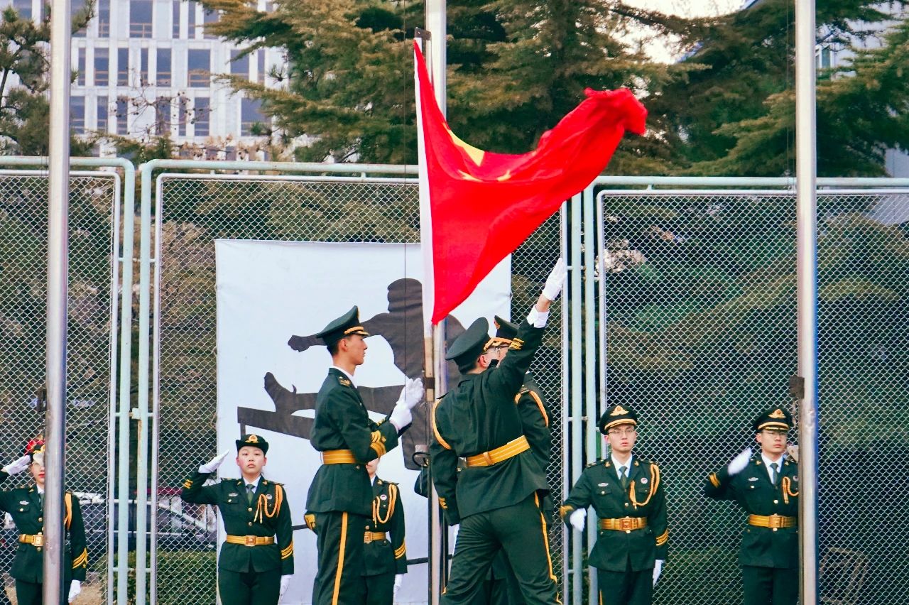 6时50分,升国旗仪式正式开始。国旗护卫队队员们昂首挺胸,齐整戎装,口号嘹亮,步伐铿锵,护送国旗走向旗台。伴随着雄壮激昂的《义勇军进行曲》,五星红旗掩映晨光,迎风招展,在全体师生的庄严注目下,冉冉升起,飘扬在操场上空。