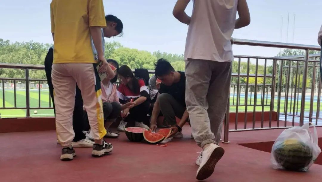 首先是两分钟的热身跑步,同学们的完成情况良好。伴随着音乐,每组20个共3组的开合跳、3组高抬腿、3组仰卧起坐,让同学们充分地拉伸了全身的肌肉。接下来进行的接力赛跑,同学们你追我赶,勇往直前,奋力进发。最有意思的莫过于踢毽子比赛和踢足球比赛。虽然大部分是女同学,但是她们的激情和热情绝不比男同学们差。炎炎夏日,同学们一个个都大汗淋漓,悉心的辅导员老师买来了西瓜让大家解暑。