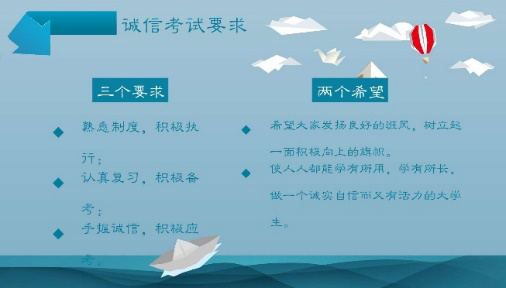 本次活动分为召开“战‘疫’必胜,诚信同行”主题“云班会”, 开展诚信作品、励志学子风采“云展示”,诚信“云签名”与诚信教育线上答题活动四部分。