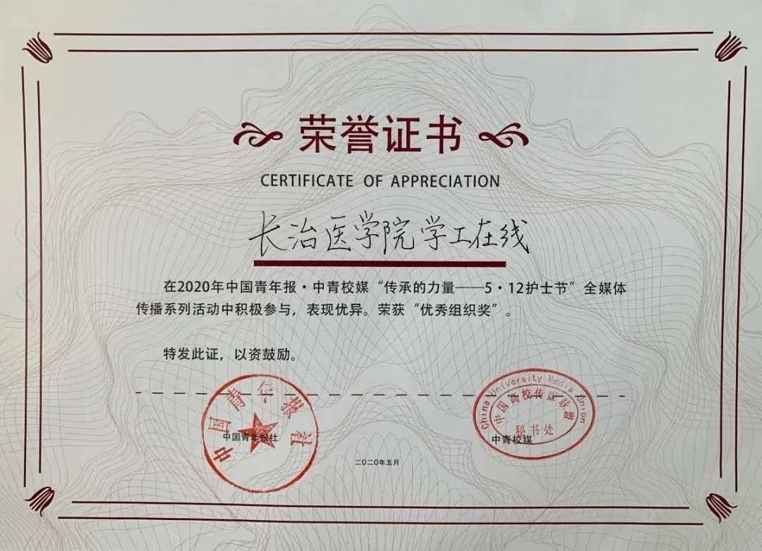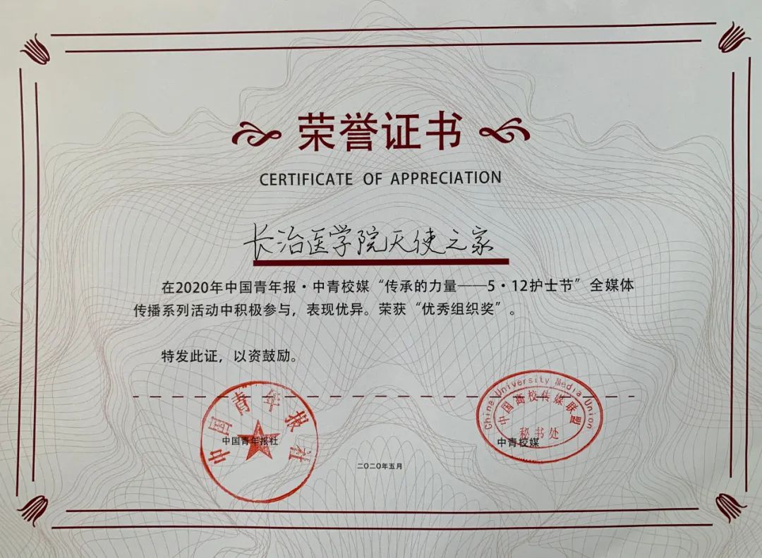 公司校园媒体在中国青年报•中青校媒“传承的力量一5•12护士节”全媒体传播系列活动中荣获“优秀组织奖”