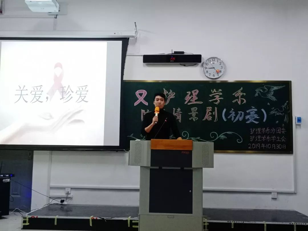 12支参赛队伍以喜闻乐见的情景剧形式宣传艾滋病相关知识,普及防艾知识,倡导消除歧视的行为,关爱艾滋病患者。几轮精彩的角逐过后,在场评委遴选出“让爱同行,愿爱远行”和“与艾的一次访谈”两支队伍代表护理系参加防艾情景剧复赛。活动接近尾声,谢冰老师对参赛队伍进行点评,并做出总结。他希望通过这次活动使同学们深刻认识我国艾滋病的蔓延情况,并扩大“防艾知识”在刚踏入大学校园的大一新生中的普及度。最后谢老师带来歌曲《与你同在》,旨在让同学们消除内心的恐惧与歧视,认识到关怀和帮助艾滋病患者是非常必要的,比起疾病本身,他人的歧视才是最大的伤害。