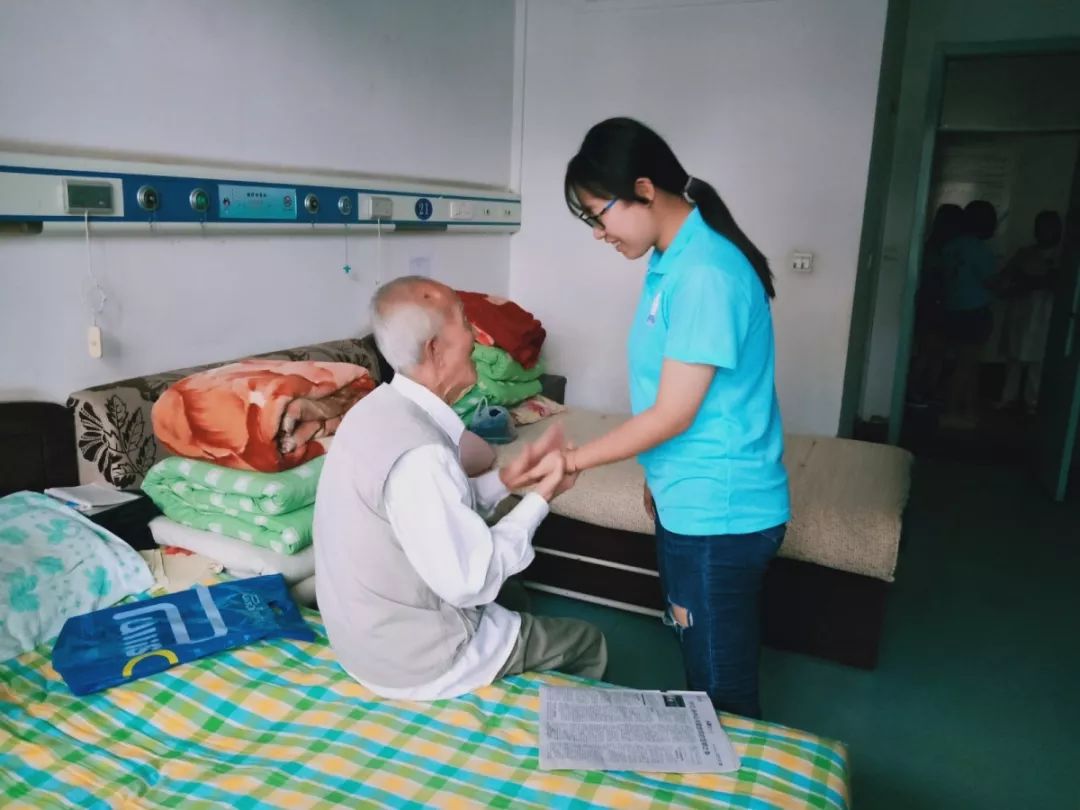 进入医院,在指导老师安排相关事宜和强调了注意事项之后,10名志愿者自行划分到不同的服务区域。与每个区域的照护站组长对接后,志愿者们开始了工作。首先志愿者们了解各层老人的生活习惯和身体状况,并与老人进行沟通,之后协助护工为老人进行了日常的服务工作,针对身体状况不同的老人实行个性化的服务内容;