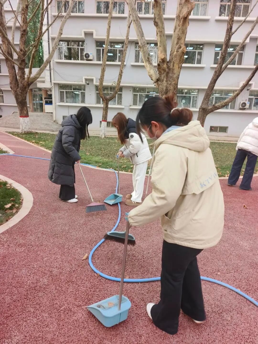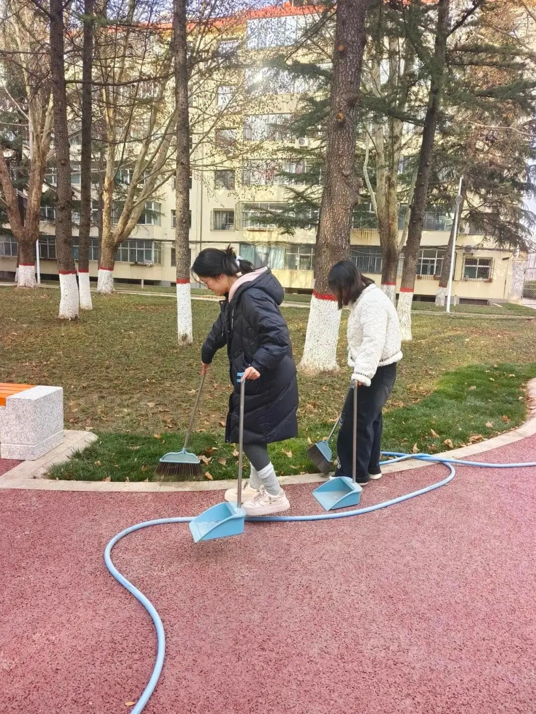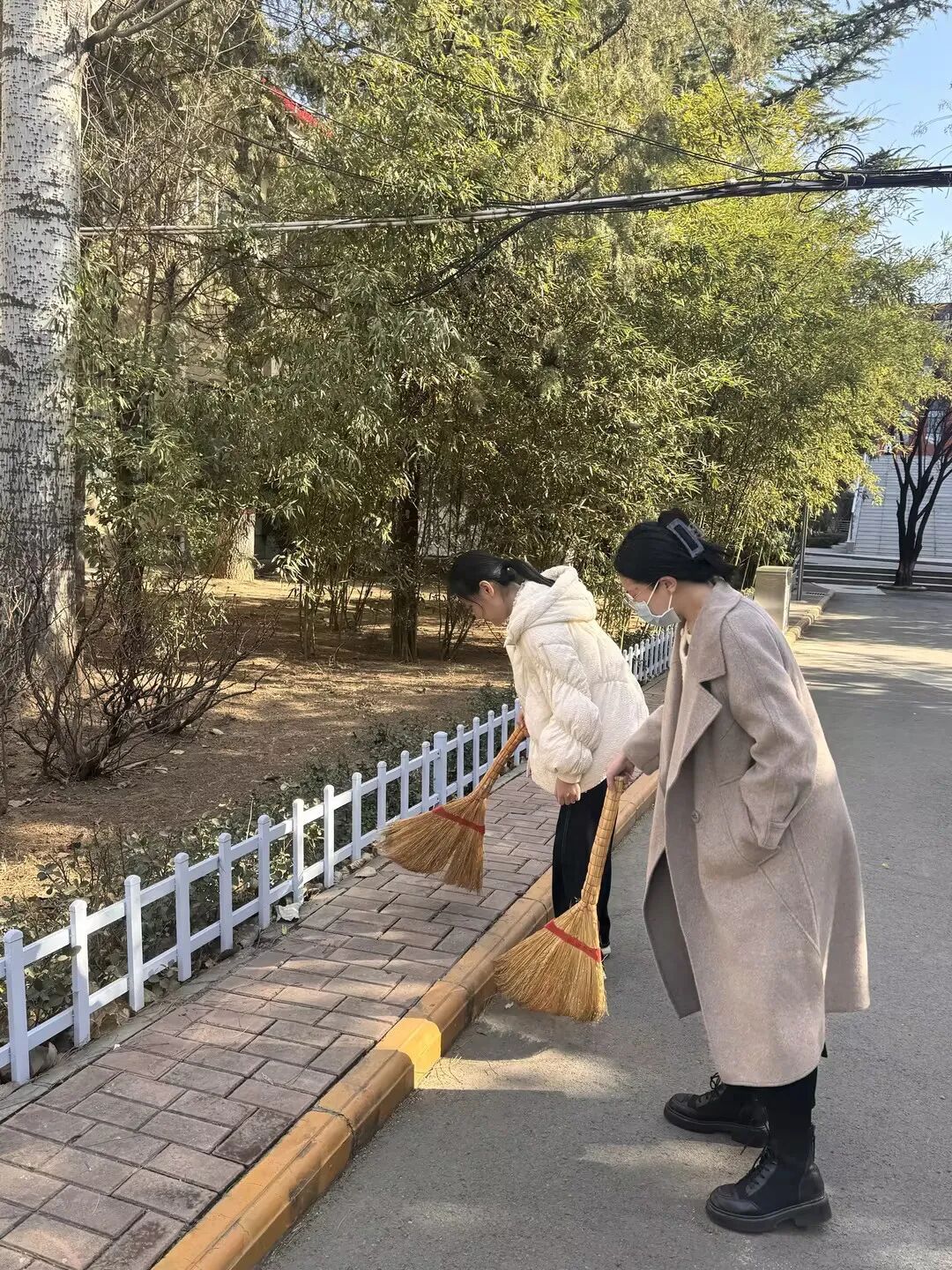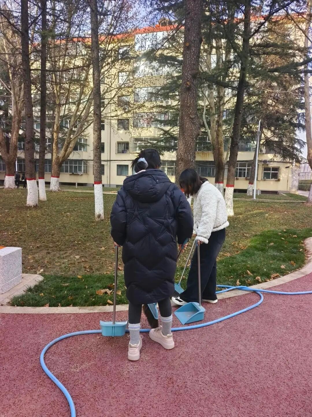 活动现场,党员同学们自带扫帚、垃圾袋等清洁工具,以南北两区为责任区域迅速分组投入劳动。南区教学楼前广场及绿化带内落叶堆积较多,大家分工协作、默契配合,手持工具细致清扫落叶,弯腰捡拾草丛中隐藏的纸屑、塑料瓶等杂物;北区区域内,大家沿着道路两侧、绿化带周边有序推进清洁工作,对散落落叶进行集中收集,对各类垃圾进行分类处理,不放过任何卫生死角,以实际行动为校园环境“焕新颜”。