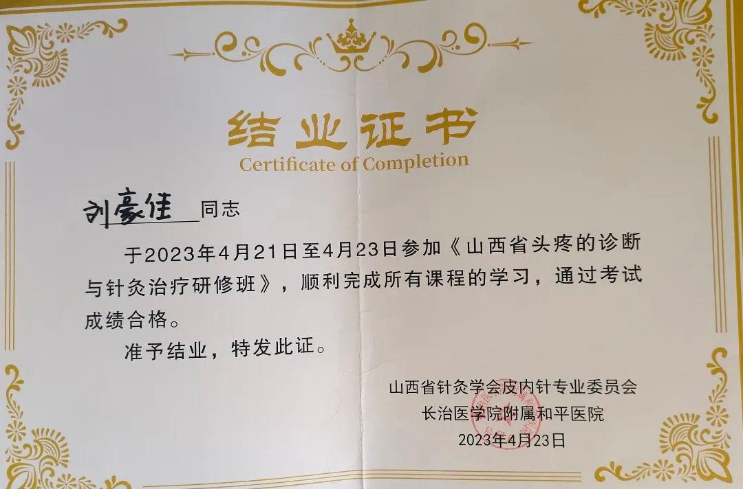 2023年《山西省头疼的诊断与针灸治疗研修班》结业证书