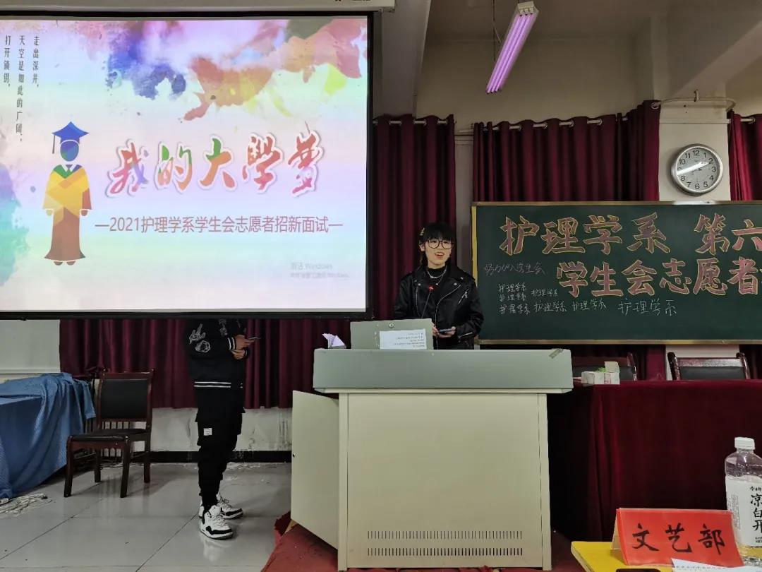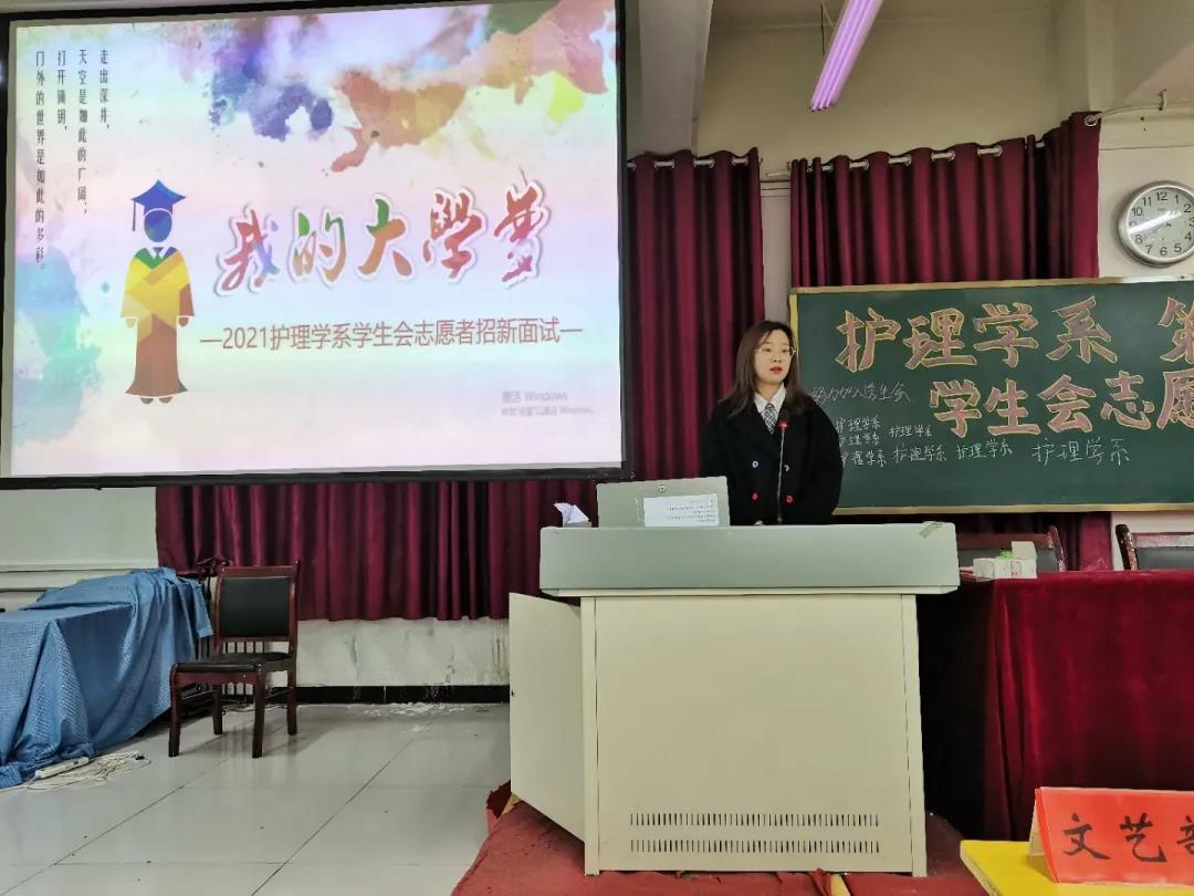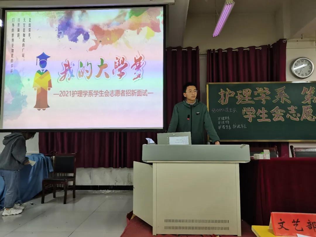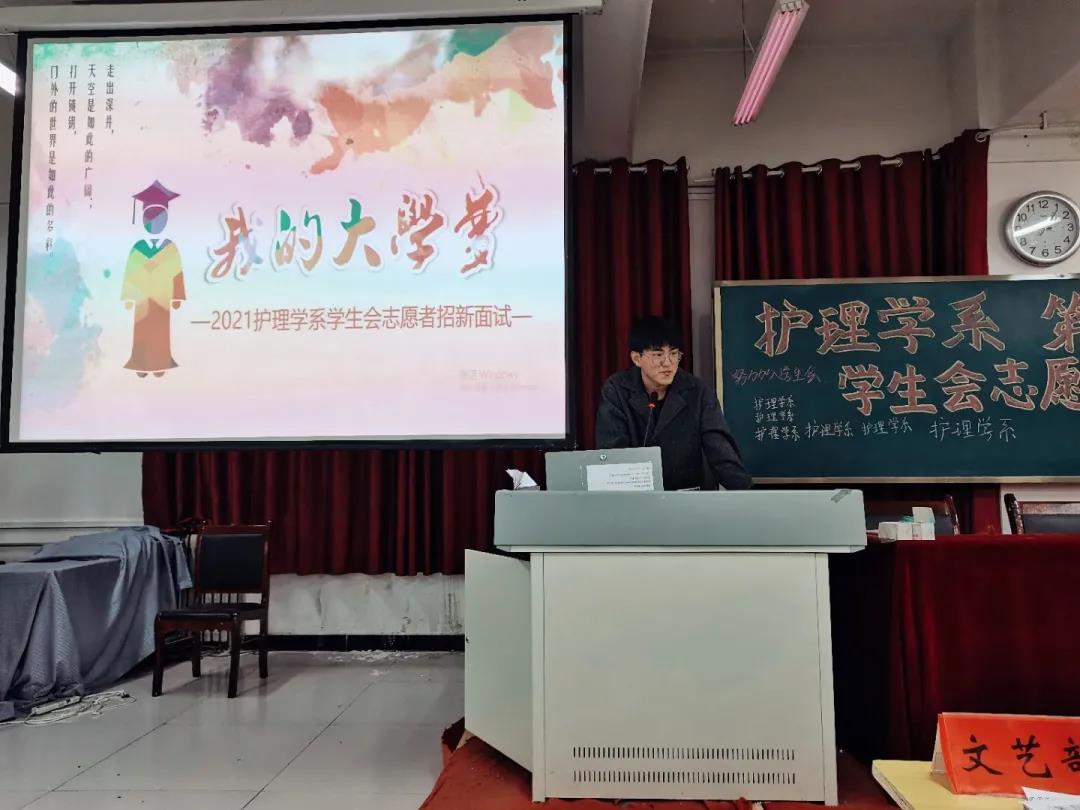24日的面试由闫俣琪同学主持,面试全程可分为三个部分,第一部分是介绍出席嘉宾和面试流程,出席本次面试的嘉宾有:护理学系员工会主席王静芳、副主席巩昊哲以及各部门负责人,第二部分是各位参加面试的同学依次上台进行自我介绍,面试内容包括自主发言、才艺展示和负责人提问,每一位同学都做好了充分的准备,以极高的热情前来参加面试。