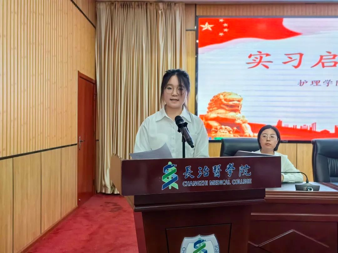 实习生代表陈俊发言,她说道,实习是将所学知识应用于实践的宝贵机会,同学们将会以谦虚的态度向老师们学习,以关爱之心对待患者,努力提升自己专业技能,展现长医学子的优良精神风貌。